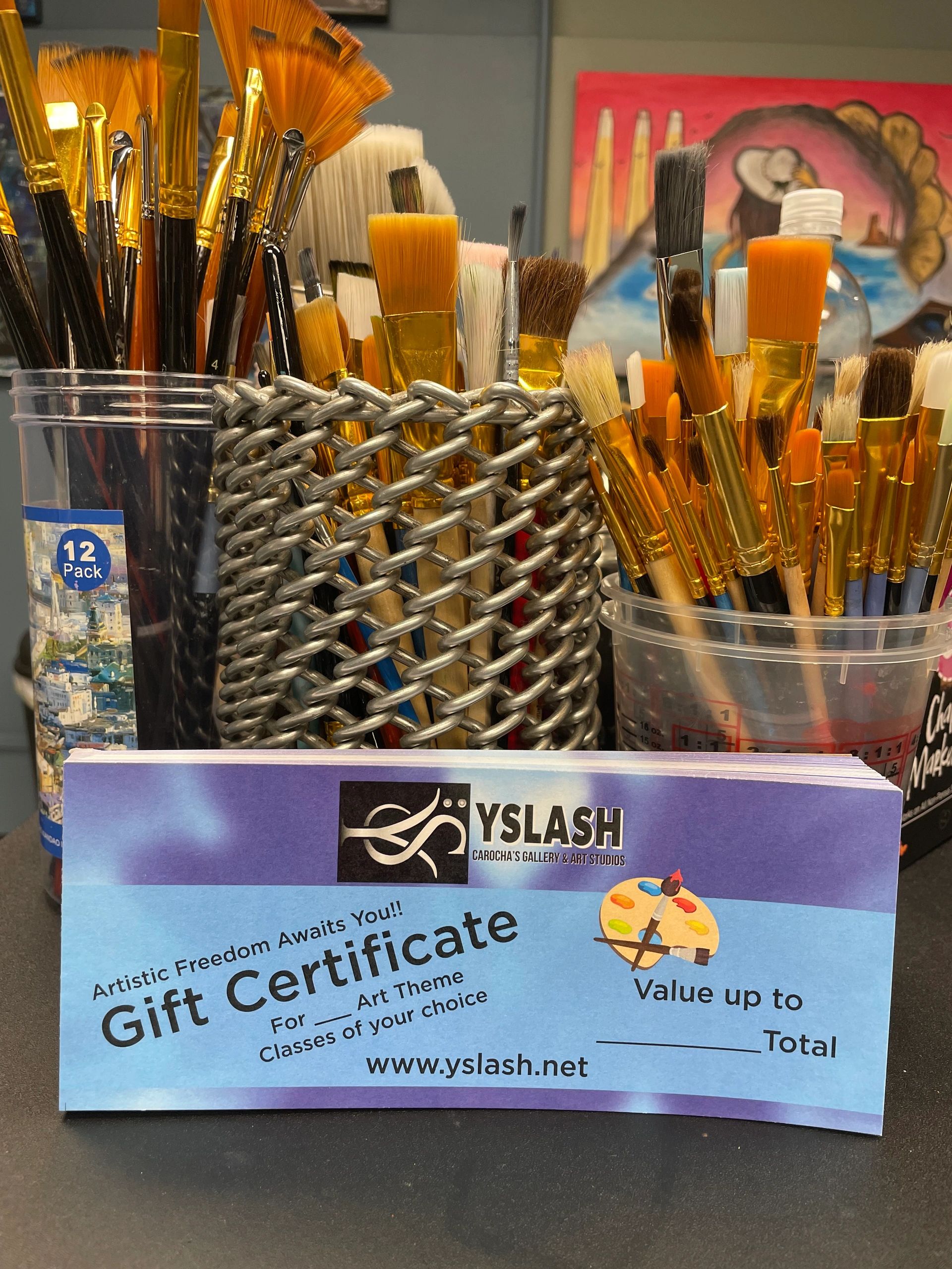 Make someone's day with a YSlash Carocha’s Gallery and Art Studios gift card. Our gift cards are perfect for art lovers and can be used to purchase any art theme classes and artwork in our gallery...